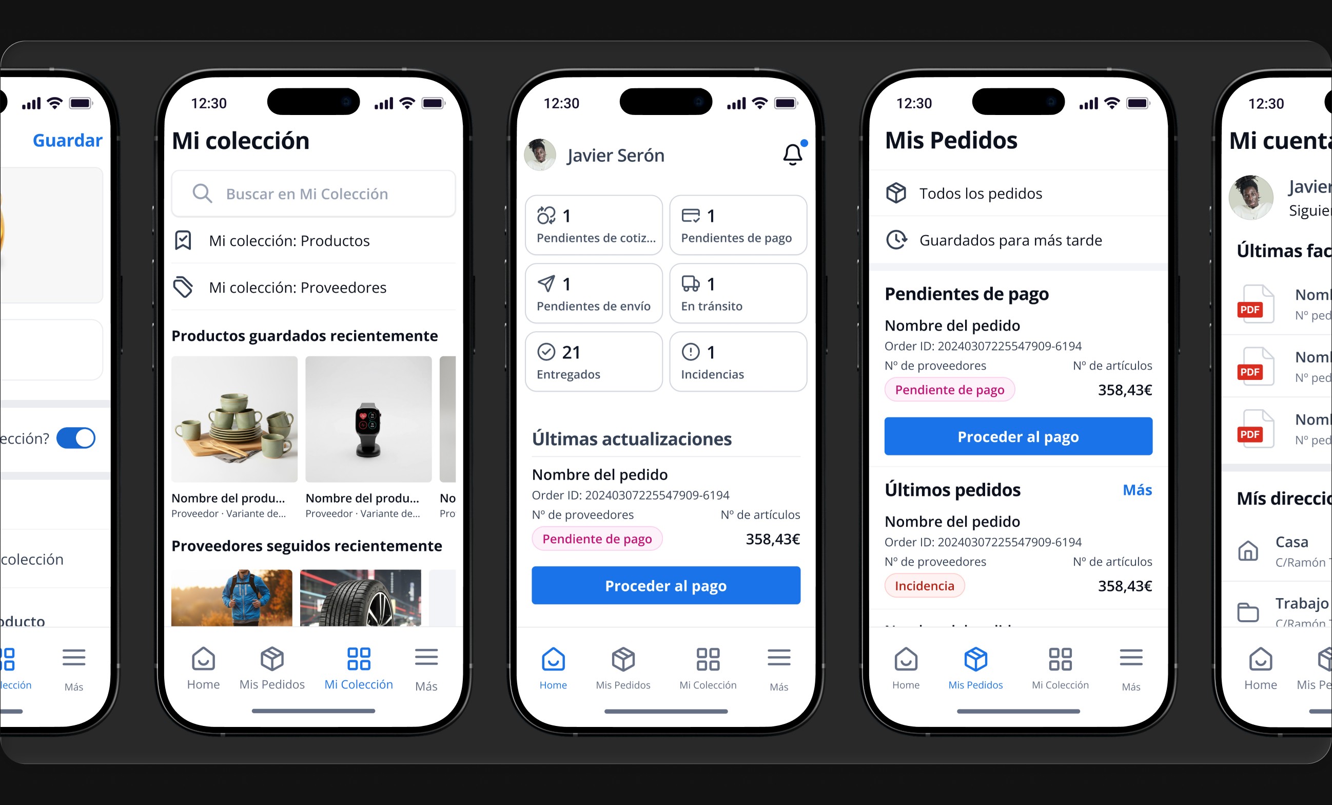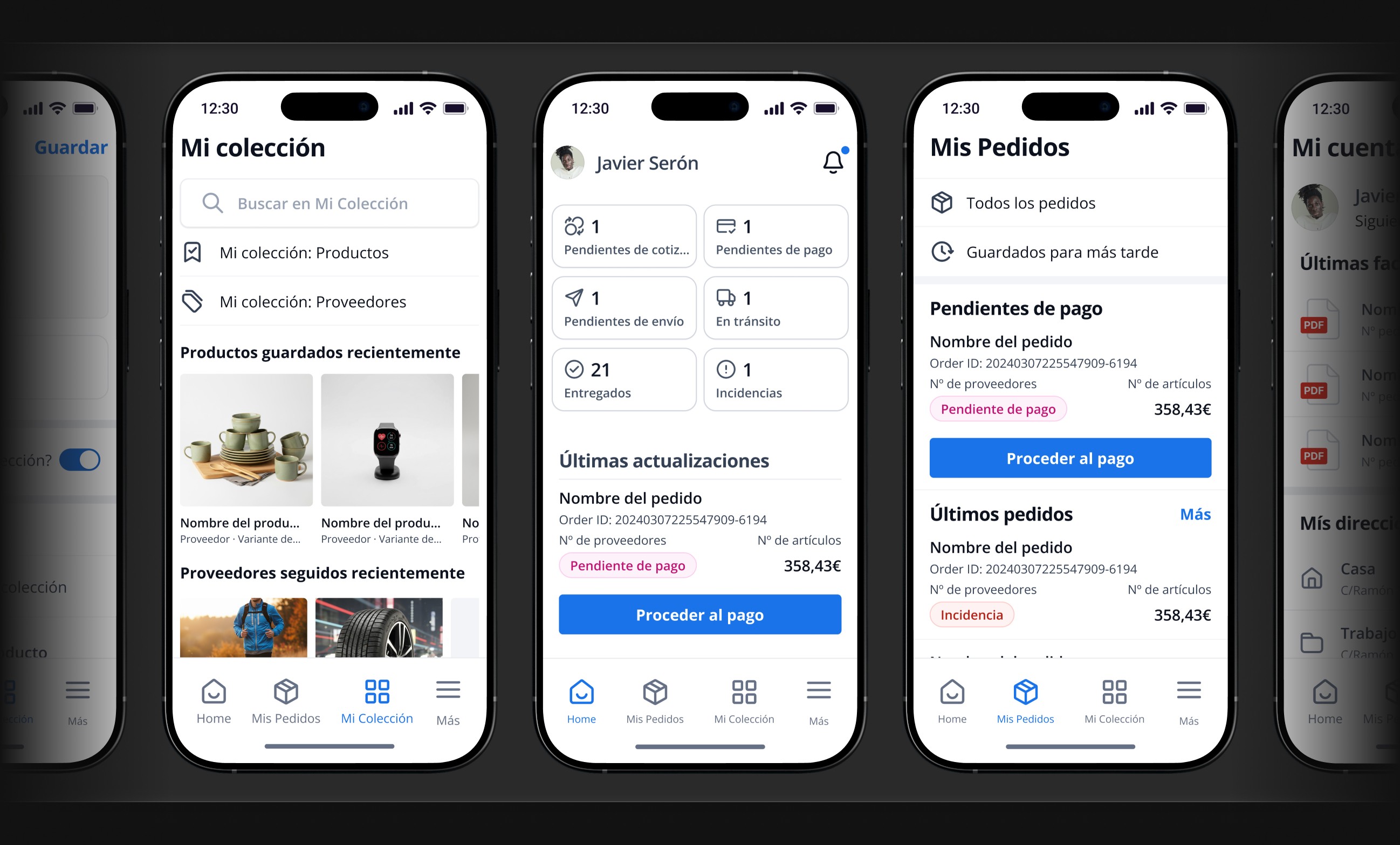 ↳ Inside each order page, users now have highly detailed information about their purchase. I also added the ability to name each order to make identification easier. Users can save individual products to collections or follow suppliers without leaving the order page. As the order status progresses, new essential information becomes available (such as direct tracking details), along with new actions like paying, downloading the invoice, or requesting a new quote.