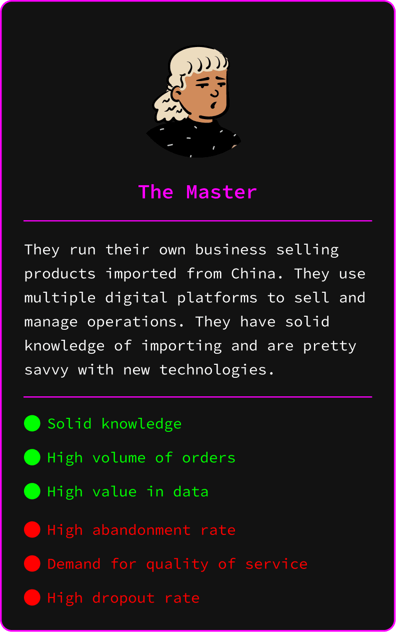 ↳ Through user research, I was able to generate three user archetypes in order to understand the needs of each one and subsequently segment them. This allowed me to move towards a product design tailored to each segment and thus democratize the product. In addition, I used this segmentation to create an individual value proposition for each one, in addition to the product's value proposition, allowing me to create a user-centered design without forgetting the business goals.