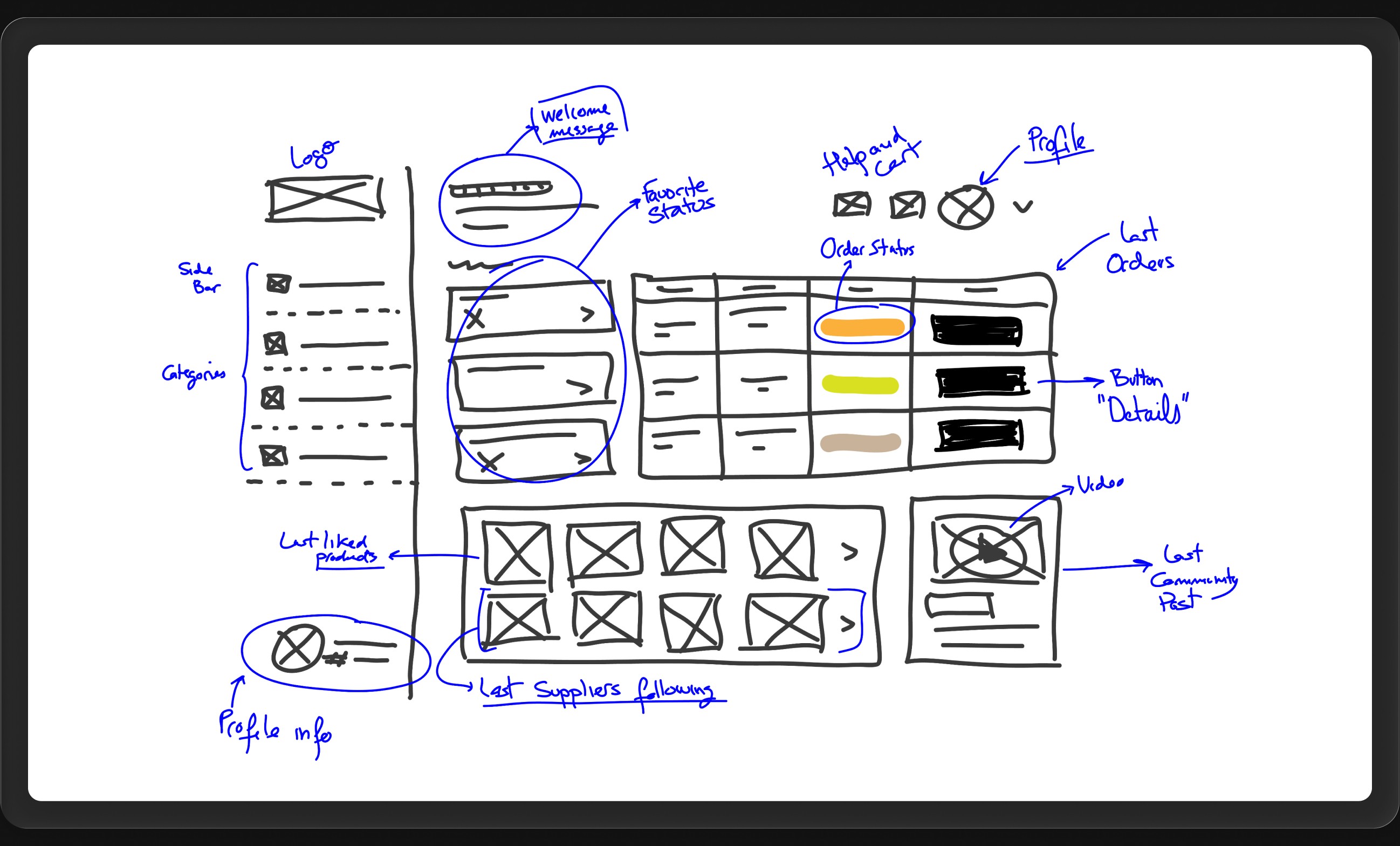 ↳ After exploring several layout options, we chose this one. This sketch helped me articulate why it was the strongest solution: a home that brings together the key elements—order overview, collections, and the latest community content.